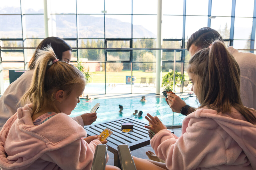 Die Therme bietet dir drei Indoor- und vier Outdoor-Becken, Relaxbereiche auf fünf Ebenen, einen abgetrennten Kinder-Bereich, Kinder-Becken sowie ein Saunadorf mit Sauna-Bar
